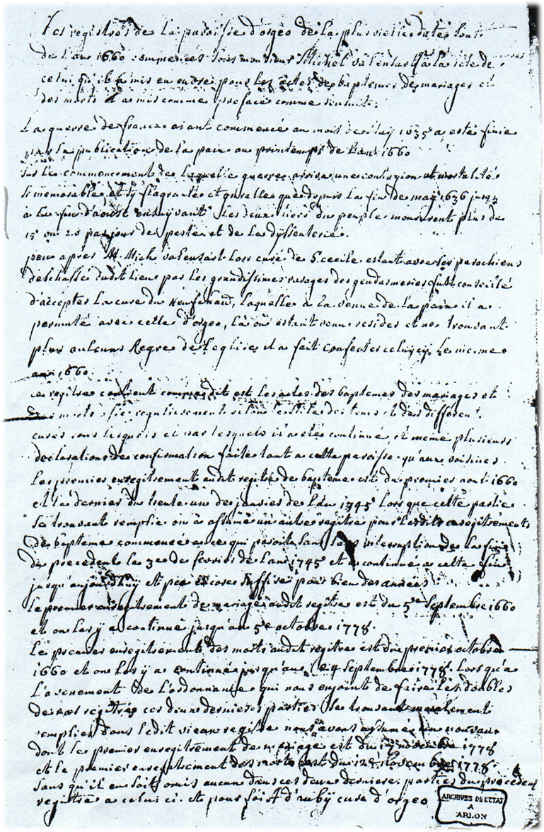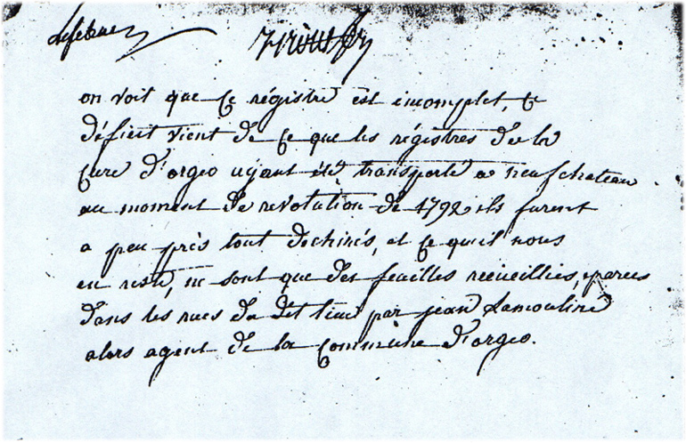 Note de 1778 de A. d'Auby, curé d'Orgeo, concernant l'histoire des registres de la paroisse
