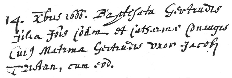 Baptême de Gertrude COLLIN fille de Joannes COLLIN et de Catherine (TRISTANI) Marraine: Gertrude (COLLIN), épouse de Jacques TRISTANI (fils de Tristan)