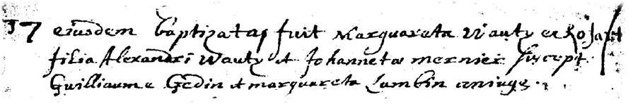 Baptême de Marguareta WAUTY (WAUTHIER) fille d'Alexandre WAUTY et de Johanneta MERNIER