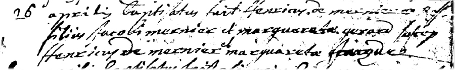 Baptême de Henricus de MERNIER fils de Jacobus MERNIER et de Marguareta (Joanna?) GERARD