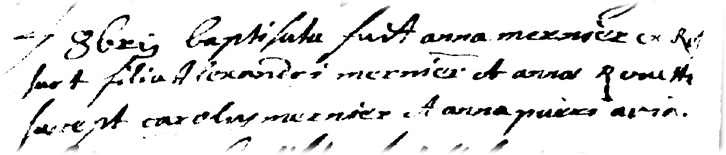 Parrain: Carolus MERNIER Marraine: Anna (WAUTHIER), grand-mère de l'enfant (pueri avia)