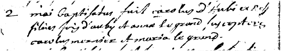 Baptême de Carolus d'AUBY fils de Joannes d'AUBY et de Anna LE GRAND
