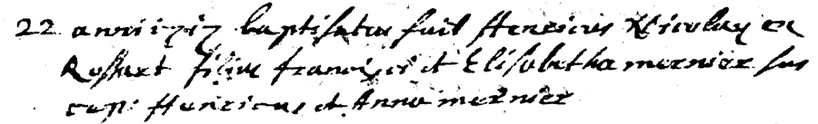 Baptême d' Henricus NICOLAY fils de François NICOLAY et d'Elisabeth MERNIER Parrain: Henricus MERNIER Marraine: Anna MERNIER