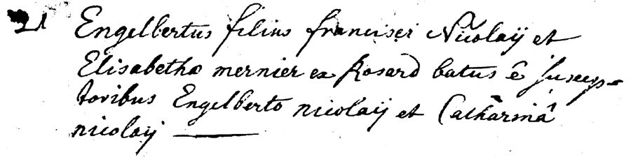 Baptême d' Englebertus NICOLAY fils de François NICOLAY et d'Elisabeth MERNIER Parrain: Englebert NICOLAY Marraine: Catharina NICOLAY
