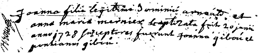 Baptême de Joanna ARNOULD fille de Dominique ARNOULD et de Anna Maria MERNIER Parrain: Pontianus GIBOU Marraine: Joanna GIBOU