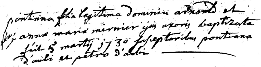 Baptême de Pontiana ARNOULD fille de Dominique ARNOULD et de Anna Maria MERNIER Parrain: Pierre d'AUBI Marraine: Pontiana d'AUBI