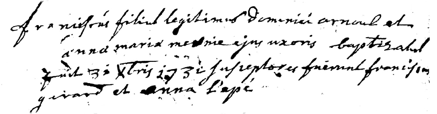 Baptême de Franciscus ARNOULD fils de Dominique ARNOULD et de Anna Maria MERNIER Parrain: Franciscus GERARD Marraine: Anna L'EPE