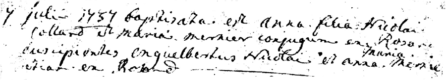Baptême d' Anna COLLARD fille de Nicolas COLLARD et de Maria MERNIER Parrain: Englebert NICOLAS Marraine: Anna MERNIER