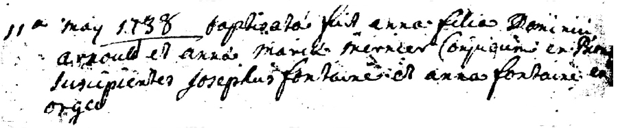 Baptême d'Anna ARNOULD fille de Dominique ARNOULD et de Anna Maria MERNIER Parrain: Joseph FONTAINE Marraine: Anna FONTAINE