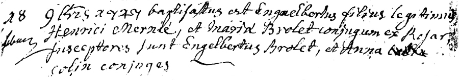 Baptême d'Englebert MERNIER fils d'Henri MERNIER et de Marie BROLET Parrain: Englebert BROLET Marraine: Anna COLIN