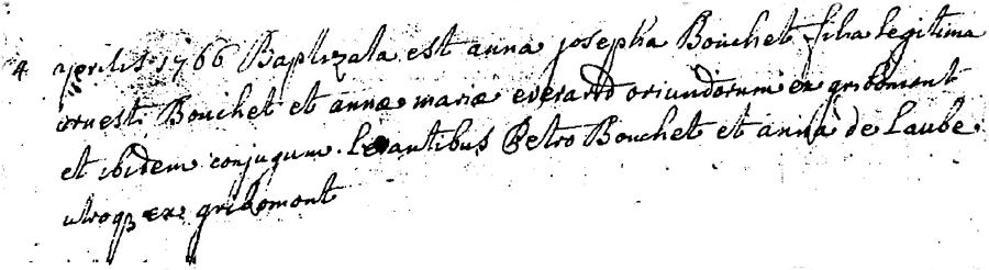 Baptême d'Anna Josepha BOUCHET fille d'Ernest BOUCHET et d'Anne Marie EVERARD Parrain: Pierre BOUCHET Marraine: Anne DELOBBE