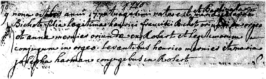 Baptême de Maria Josepha BICHOT fille de Henri François BICHOT et d'Anna MERNIER Parrain: Henri MERNIER Marraine: Marie Joseph HARMAN