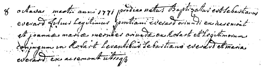Baptême de Sebastien EVERARD fills de Poncelet EVERARD et de Jeanne Marie MERNIER Parrain: Sebastien EVERARD Marraine: Marie EVERARD