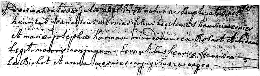 Baptême de Henri François MERNIER fils de Henri MERNIER et de Marie Joseph HARMAN Parrain: Henri François le BICHOT Marraine: Anna MERNIER, son épouse