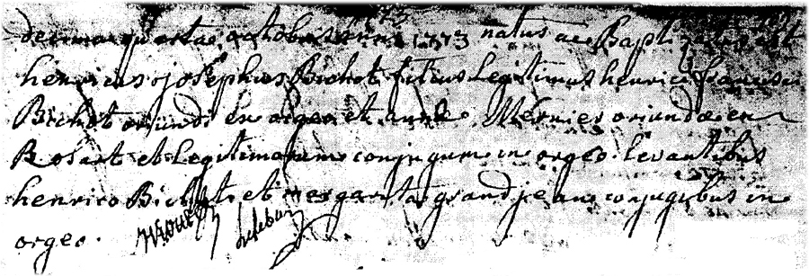 Baptême de Henri Joseph BICHOT fils de Henri François BICHOT et d'Anna MERNIER Parrain: Henri BICHOT Marraine: Marguerite GRANDJEAN
