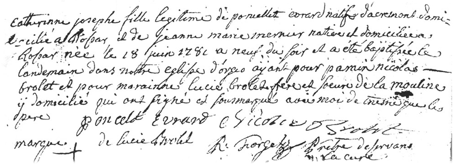 Baptême de Catherine Joseph EVERARD (née le 18/06/1781) Fille de Poncelet EVERARD et de Jeanne Marie MERNIER Parrain: Nicolas BROLET - Marraine: Lucie BROLET