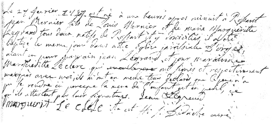 Baptême de Jean MERNIER Fils de Louis MERNIER et de Marie Marguerite LEGRAND Parrain: Jean LEGRAND Marraine: Marguerite LECLERC