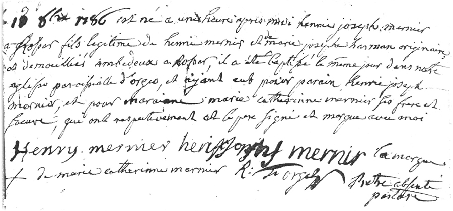 Baptême de Henri Joseph MERNIER Fils de Henri MERNIER et de Marie Joseph HARMAN Parrain: Henri Joseph MERNIER Marraine: Marie Catherine MERNIER, ses frère et soeur