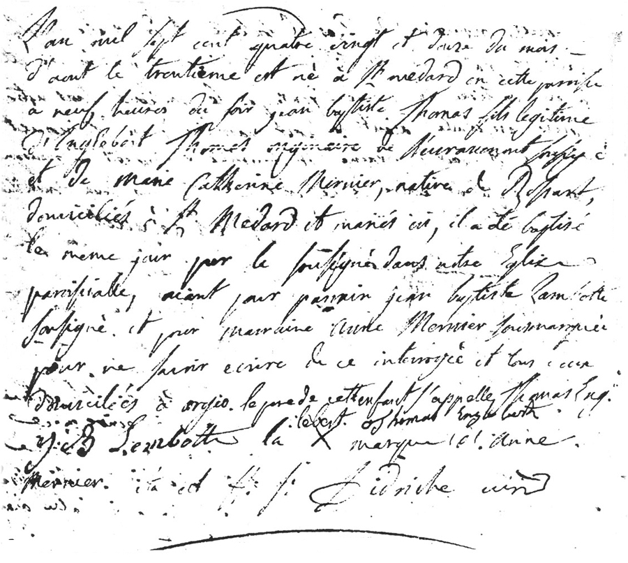 NB Des erreurs de nom sont corrigés en bas de l'acte; le prénom du père (Thomas) avait été inscrit comme nom de famille.