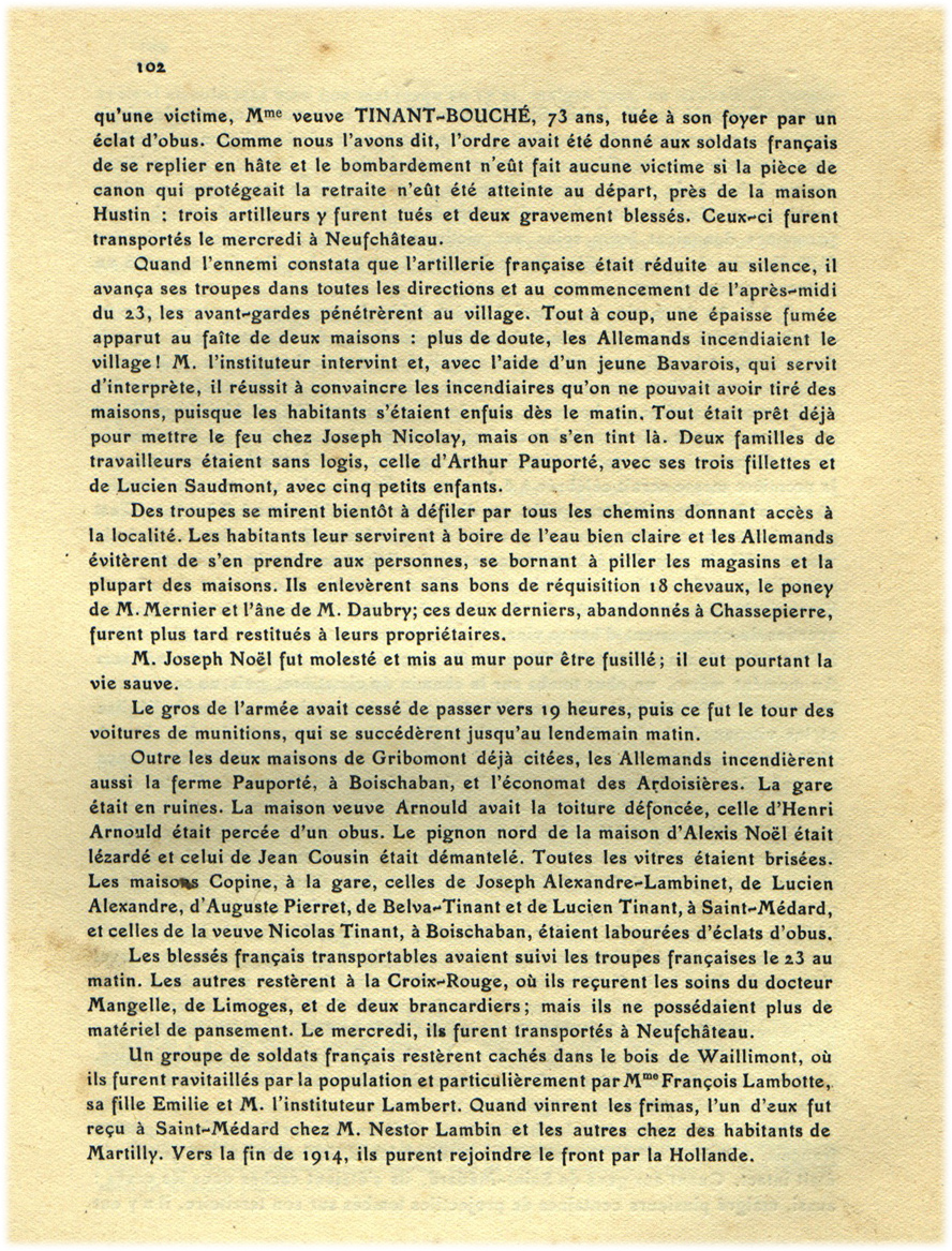 In "L'invasion allemande dans les Provinces de Namur et de Luxembourg" Schmitz J. et Nieuwland N., Tome VII, 1924, pp. 98-102