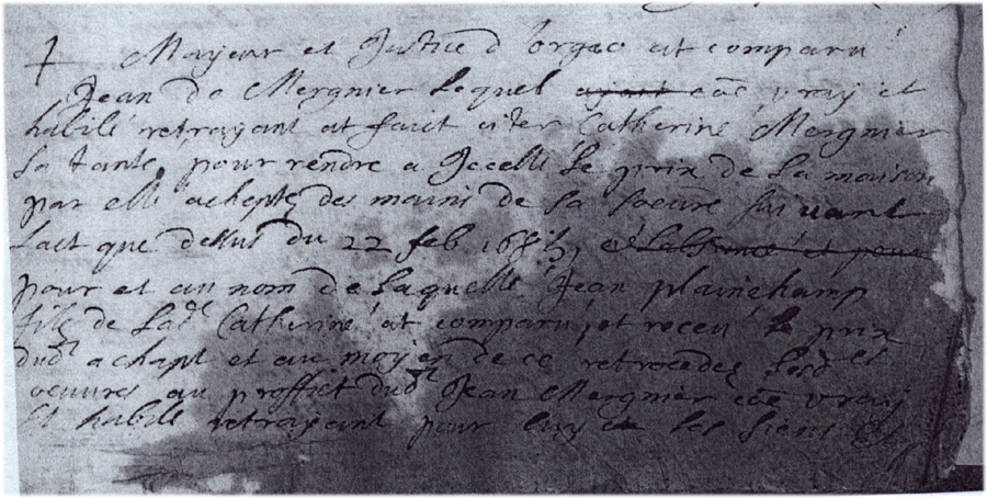 A la suite de cet acte, on trouve un second acte du 10 février 1686 qui stipule que cette maison est rachetée par Jean de MERGNIER à sa tante Catherine représentée par son fils Jean PLAINCHAMP.
