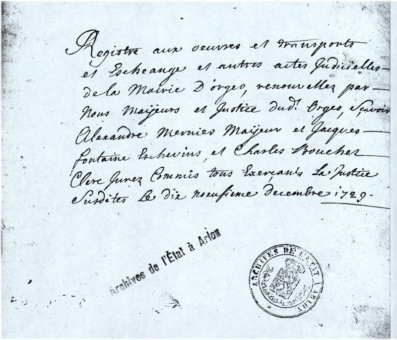Registre des Oeuvres de loi de la Mairie d'Orgeo 2079 Page de garde du Registre des Oeuvres de loi ouvert le 19 décembre 1729