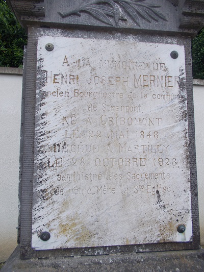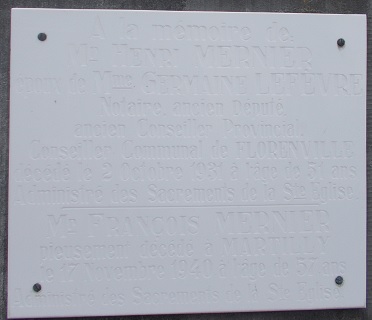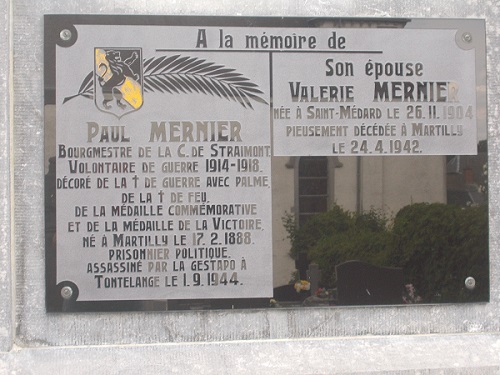 ![]() Le village de Martilly a fait partie de la commune de Straimont jusqu'à la fusion des communes le 01/01/1977. Depuis cette date, Martilly est une section de la commune de Herbeumont . Deux bourgmestres de Straimont sont issus de la famille: Ce dernier a été assassiné par la Gestapo à Tontelange le 1er septembre 1944. Une plaque commémorative est apposée sur la façade de l'église: La paroisse:Une rue Paul MERNIER a également été dénommée en souvenir: ![]() La