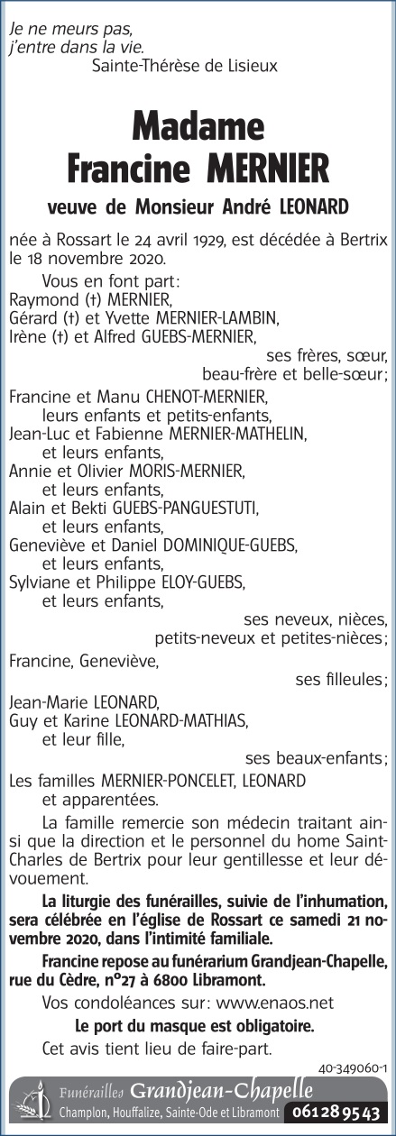 Fille de Jean-Joseph MERNIER (1897-1983) et de Marie PONCELET