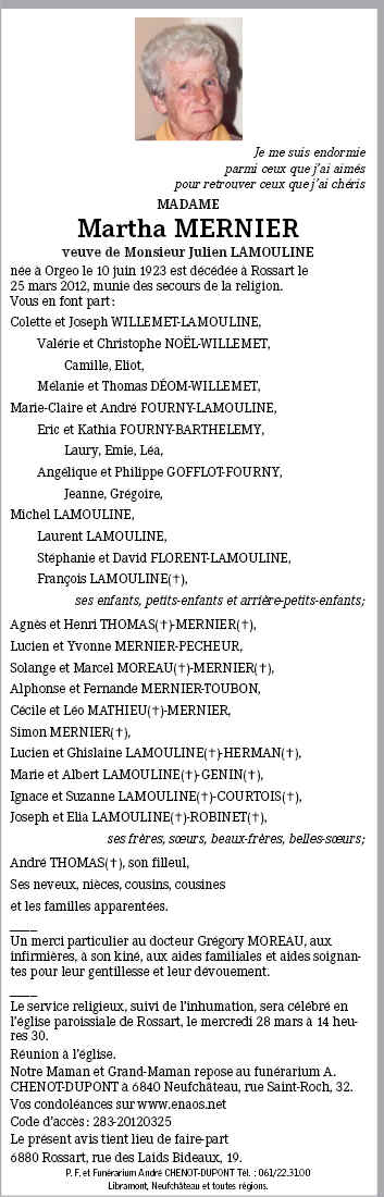 Fille de Jean Joseph MERNIER (1891-1962) et de Marie Anne MAISSIN (1896-1968) Epouse de
