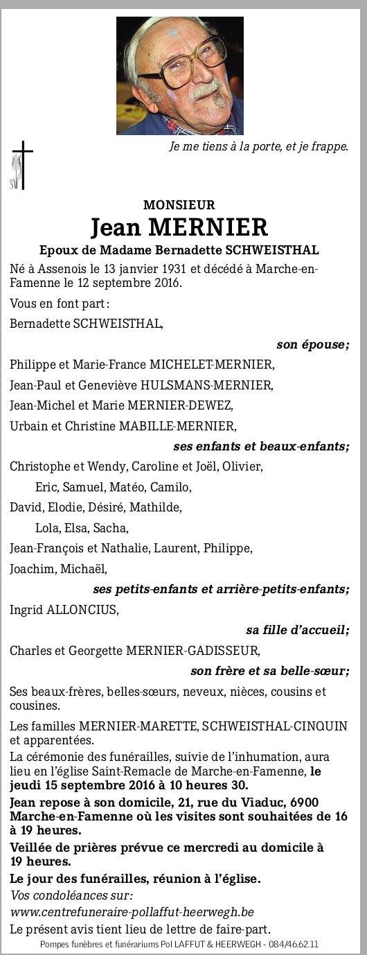 Jean MERNIER 1931-2016 époux de Bernadette SCHWEISTHAL