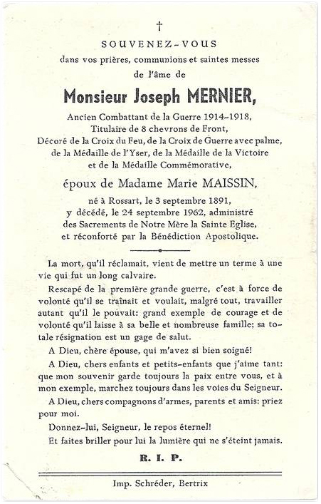 (Jean) Joseph MERNIER 1891-1962 Fils de Léon Joseph MERNER et de Marie Victoire THOMAS Epoux de Marie MAISSIN 1896-1968