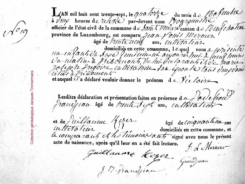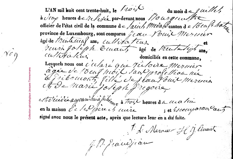Victoire MERNIER (1837 - 1838) fille de Jean-Louis MERNIER (1798 - 1846) et de Marie-Joseph GREGOIRE (1798)